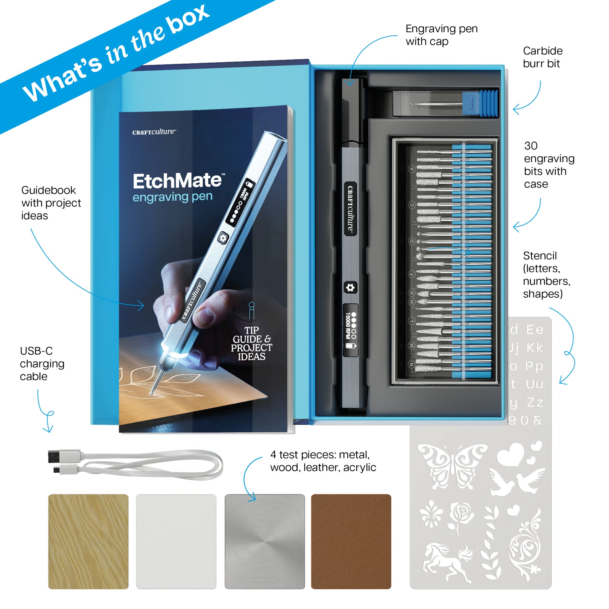 - PRECISION. POWER. POSSIBILITY: Unleash your creativity with the Craft Culture EtchMate — a precision engraving pen designed for wood, glass, metal, leather, and more. With 31 pro-grade bits, an LED work light, and adjustable speeds up to 20,000 RPM, it transforms everyday objects into personalized works of art.
