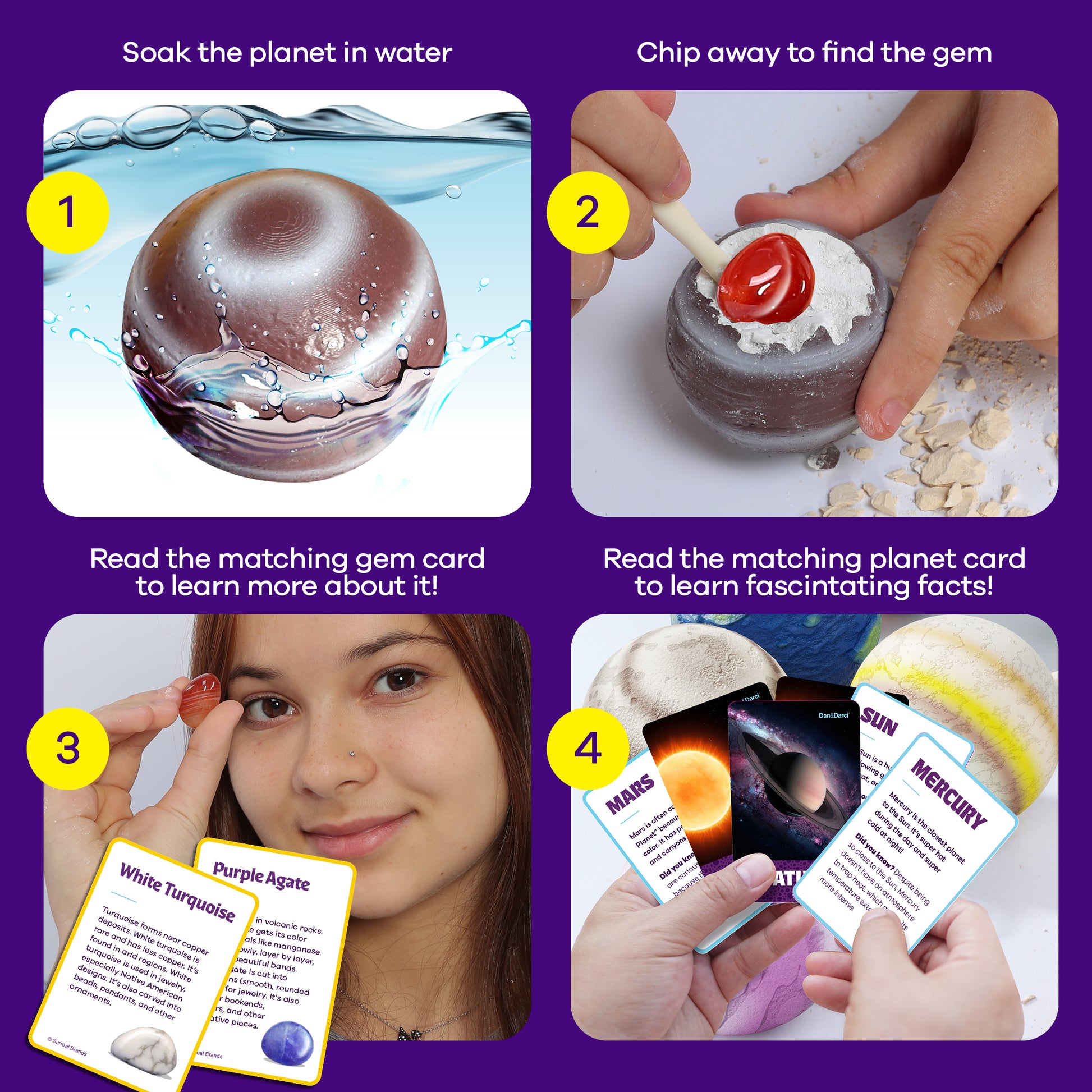 - SOAK, CHIP, AND REVEAL AMAZING GEMS: Simply soak each planet, dig and chip away with the chisel and brush, and watch as shimmering gems emerge! This hands-on journey is perfect for young explorers eager to uncover hidden wonders.
