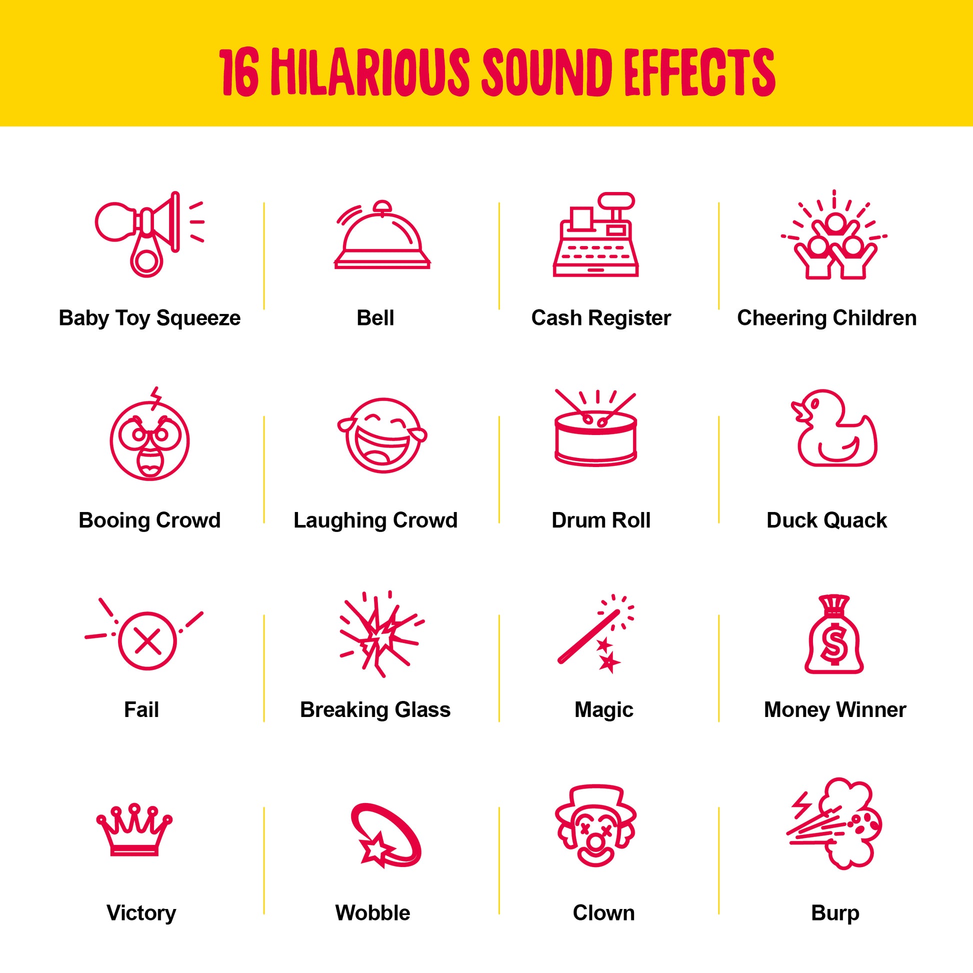 - HILARIOUS SOUND EFFECTS FOR ENDLESS FUN: Packed with 16 laugh-out-loud sound effects like duck quacks, burps, crowd laughter, boos, wobble sounds, and more. Whether you're pranking friends or lighting up a party, the fun never stops!