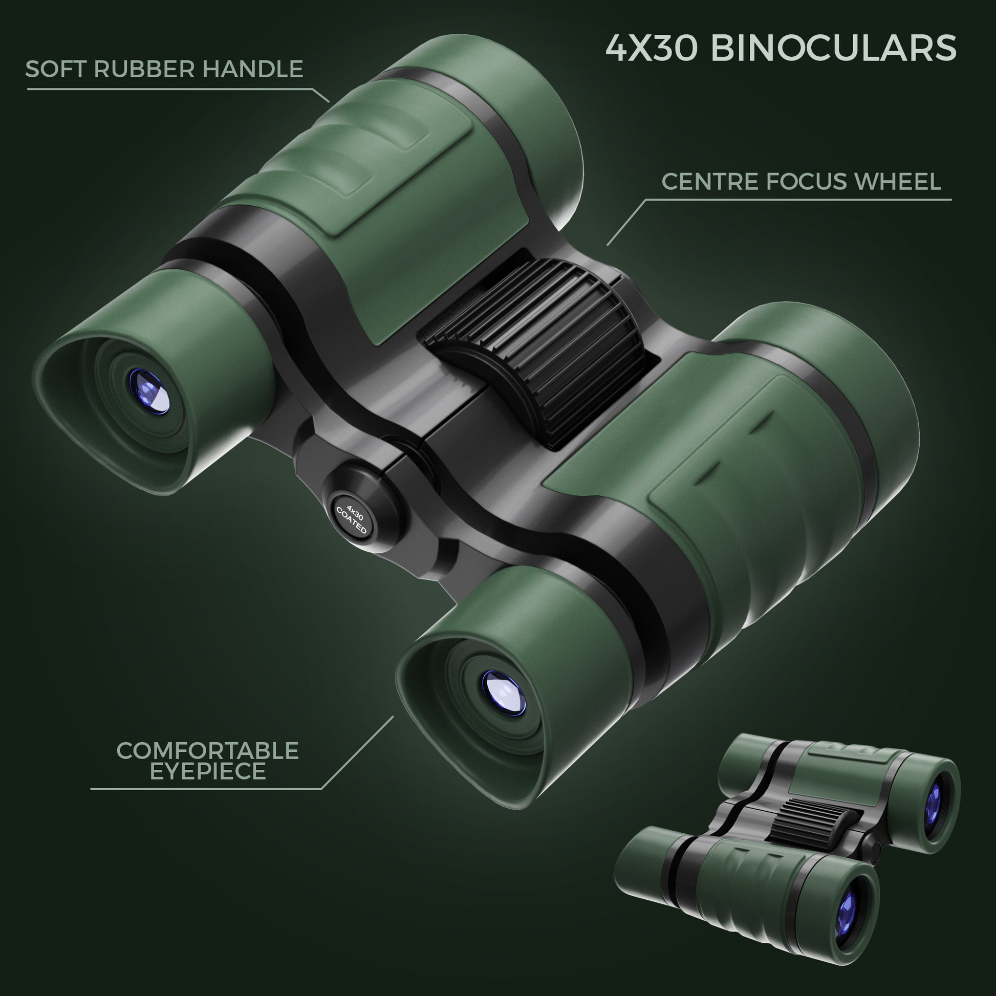 - BINOCULARS (4X30 MM): Perfect for bird watching, exploring nature or spying on faraway animals. Made from quality shockproof rubber for extra comfort and includes rubber eye-protection & neck strap for easy carrying.