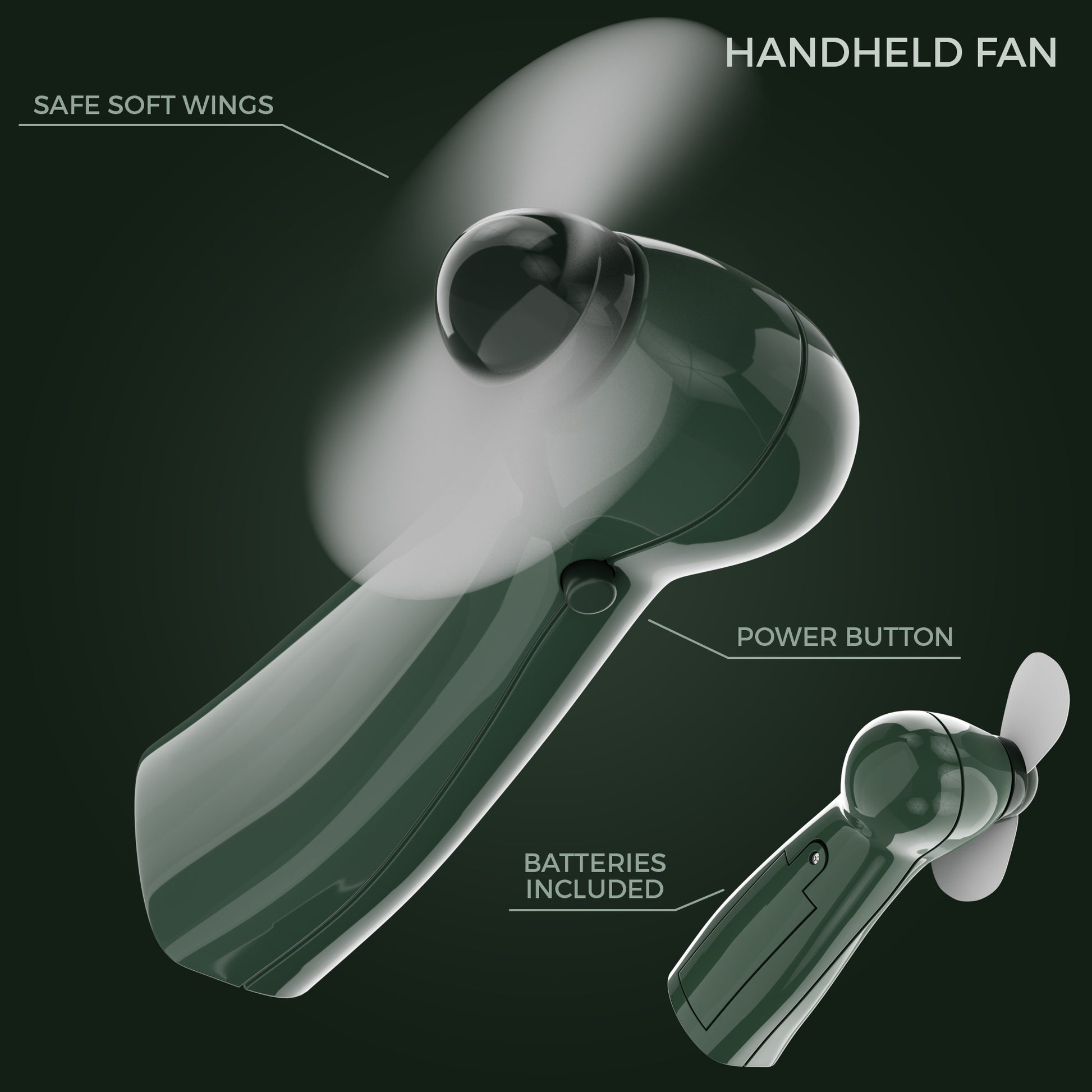 - HANDHELD FAN: Cool off on hot summer days with the battery-operated handheld fan with safe soft wings (batteries included).