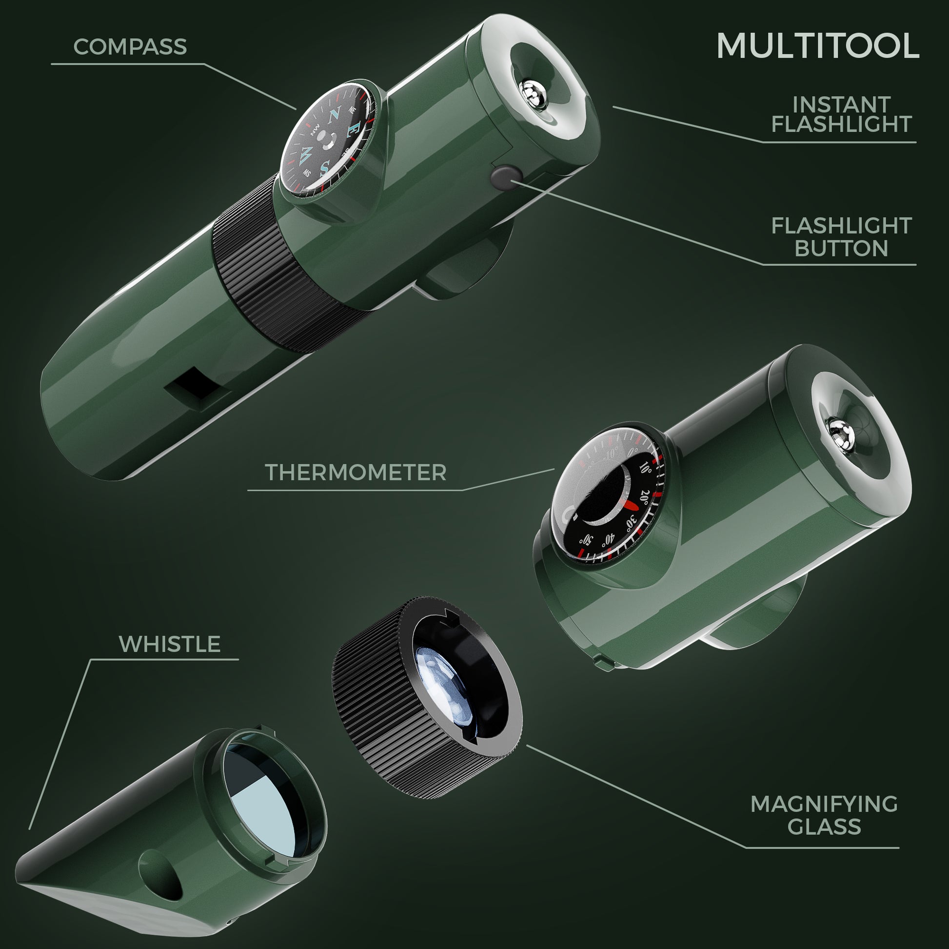 - MULTI-TOOL (WITH 5 FUNCTIONS): COMPASS: Perfect for learning basic directions and how to read maps. Thermometer: Also learn about Celsius & Fahrenheit with the included guide. Whistle: Have fun playing outdoor games. Instant flashlight: For that moment that you need a quick light. Magnifying glass: An additional specialized magnifying glass.