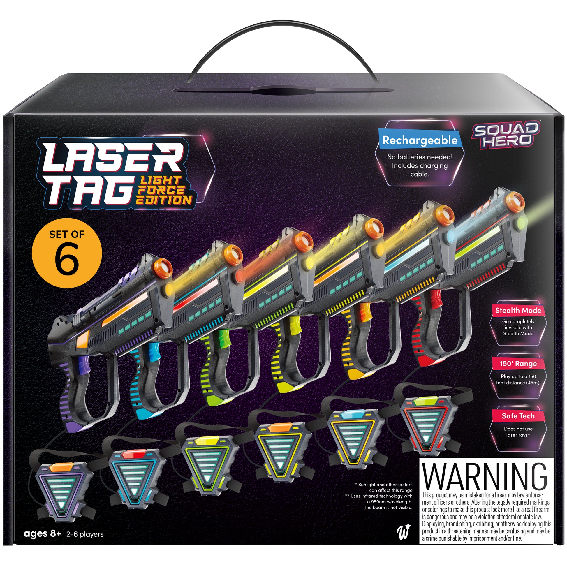 - LASER TAG LIGHT FORCE EDITION: Delivers hours of action-packed, adrenaline-pumping fun wherever you set up the battleground! With quick setup and long-life rechargeable gear, you'll be up and running - and shooting - in no time. Just pick your teams (or go solo!), strap on your gear, and get ready to battle! Run, hide, roll, take aim, and eliminate your enemies to win the game! Includes: 6 guns and vests, a charging cable.